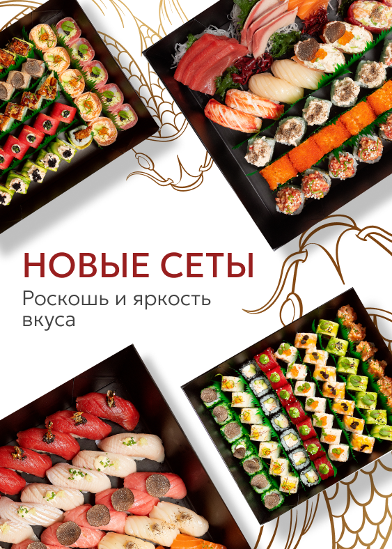 Дайкон, тунец Бигай, лосось, мясо краба, огурцы, авокадо, икра тобико, икра черная, сусальное золото, трюфельное масло