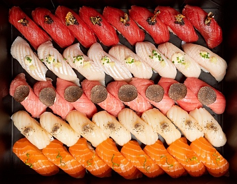 Состав:суши блюфин с черной икрой и золотом 8шт,суши торо с трюфелем 8шт,суши лакедра брюшко с имбирем и зеленым луком 8шт,суши лосось с красной икрой 8шт,суши гребешок с трюфелем 8шт.