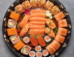 Сашими с лососем 2 п., калифорния с лососем 1 п., филадельфия 1 п., ролл с острым лососем 1 п., ролл с лососем 1п., суши с лососем 2 шт., спайси суши с лососем 2 шт., суш...
