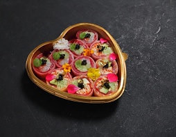 Дайкон, тунец Бигай, лосось, мясо краба, огурцы, авокадо, икра тобико, икра черная, сусальное золото, трюфельное масло